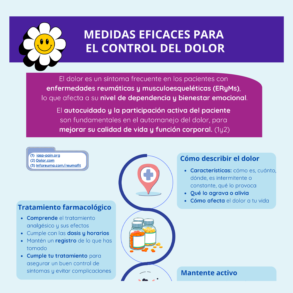 El dolor es un síntoma común que afecta a la autonomía y bienestar emocional de los pacientes con enfermedades reumáticas y musculoesqueléticas (ERyMs) . De cara a mejorar la calidad de vida y función corporal, el autocuidado y la participación activa del paciente en el manejo del dolor son esenciales. Para más información, haga click sobre la imagen o en el PDF Medidas eficaces para el control del dolor.