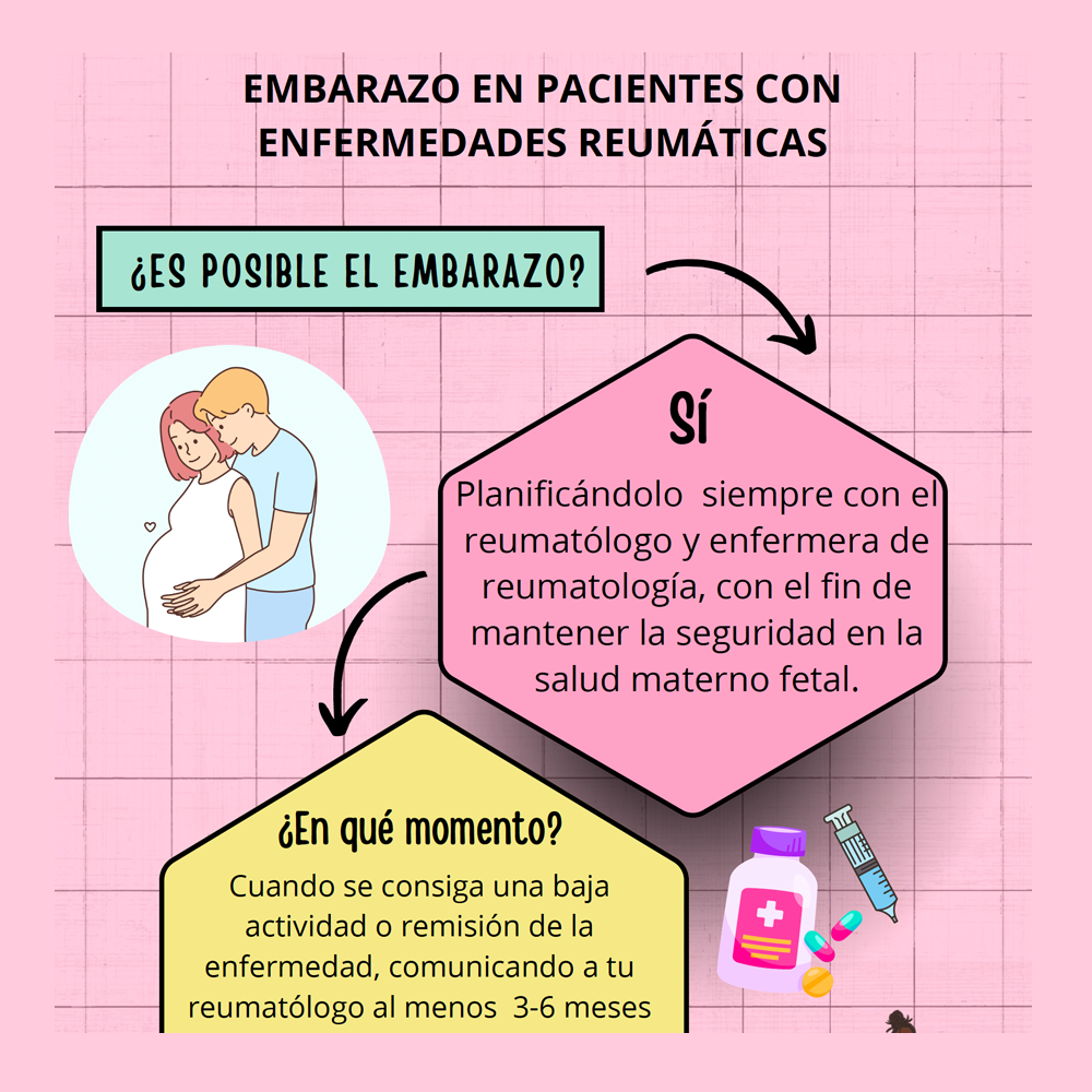 Es fundamental planificar el embarazo con el reumatólogo y la enfermera de reumatología de cara a garantizar la seguridad materno-fetal mediante un adecuado control y seguimiento que minimice riesgos evitables. Para más información, haga click sobre la imagen o en el PDF Embarazo en pacientes con enfermedades reumáticas.
