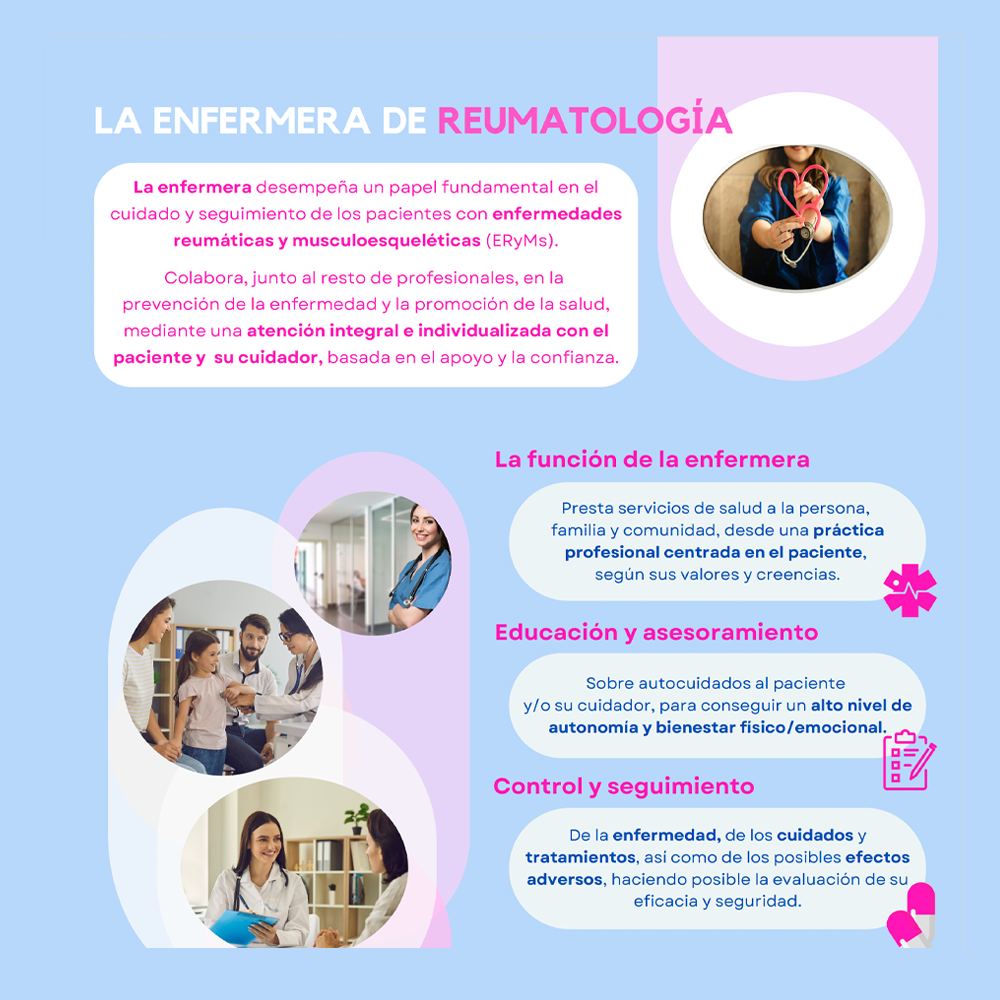 La enfermera desempeña un papel esencial en el cuidado y seguimiento de los pacientes con enfermedades reumáticas y musculoesqueléticas (ERyMs). En colaboración con otros profesionales, contribuye a la prevención de la enfermedad y la promoción de la salud, brindando una atención integral e individualizada, centrada en el paciente, basada en una relación de apoyo y confianza. Para más información, haga click sobre la imagen o en el PDF La enfermera de reumatología.