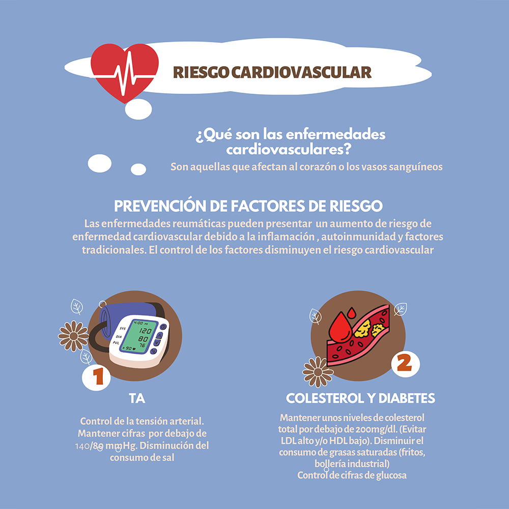 Las enfermedades reumáticas se asocian a un mayor riesgo de enfermedad cardiovascular debido a la inflamación, la autoinmunidad y los factores de riesgo tradicionales. El control de estos factores disminuye el riesgo cardiovascular. Para más información, haga click sobre la imagen o en el PDF Riesgo cardiovascular.